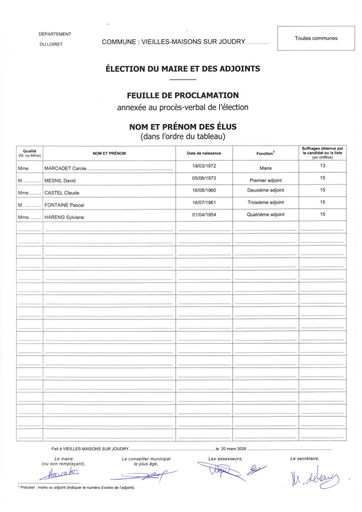 Mme Carole Marcadet, ayant obtenu la majorité absolue, a été proclamée maire et a été installée.